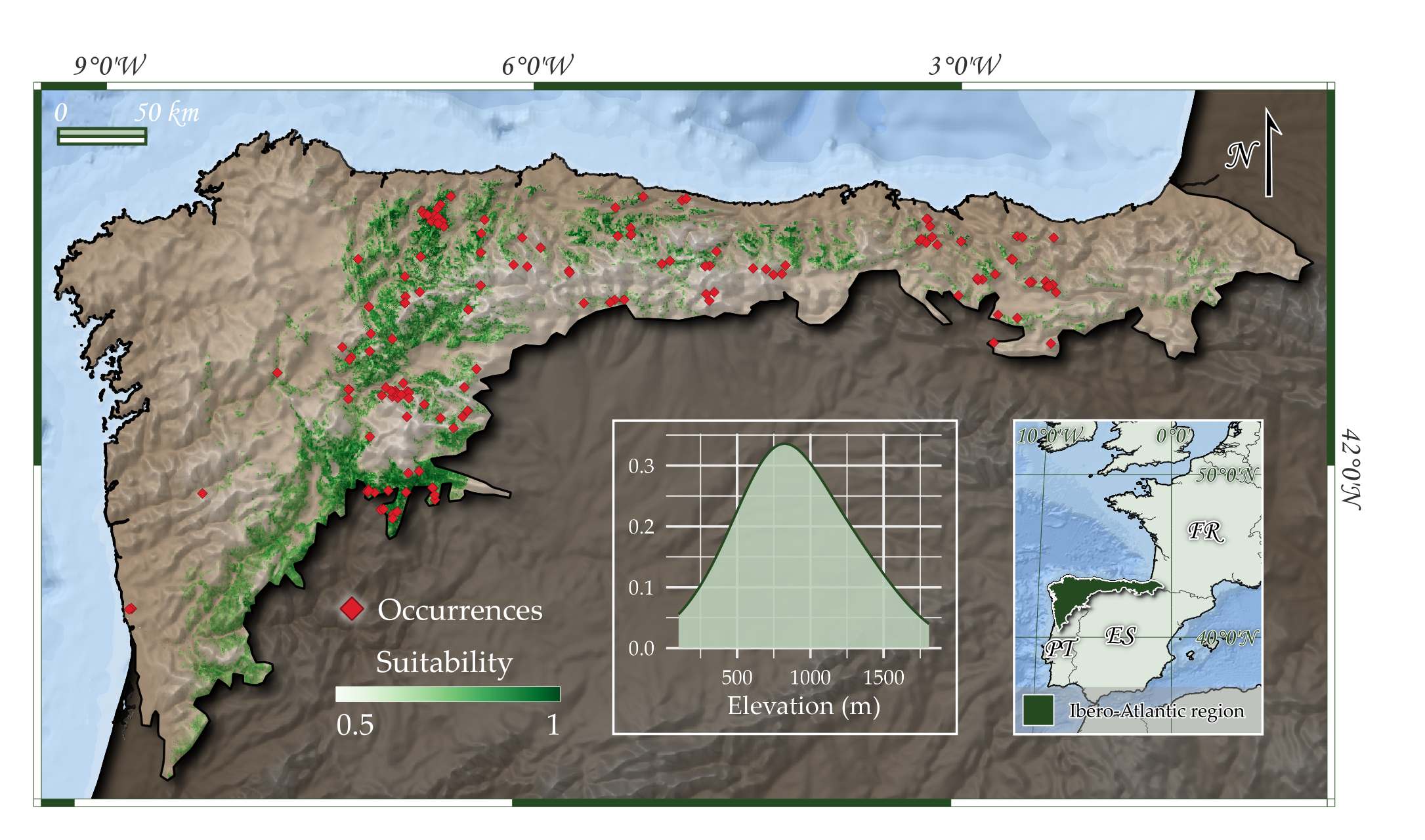 This scrub occurs mostly as a fringe of forests in units T182, T19A, T1By and T1D7, thriving on more organic and less readily drained soils than those colonised by broom communities of block S33. The small seeds of the dominant species enable a rapid colonisation of clearings and fringes, but as soon as birds kick-in, the evolution towards thickets of unit S353 is fast. Since the dominant species is a heath, we opt for creating the necessary new unit (all EUNIS units mentioning Erica arborea, mostly in the block @S5, correspond to purely Mediterranean communities, highly different from these very original neatly Atlantic and often almost paradoxically orophilous and cold- and snow-resistant shrublands) within S42, but the just described spatiotemporal position would rather suggest its inclusion in S33, as traditionally done by syntaxonomical formalism).