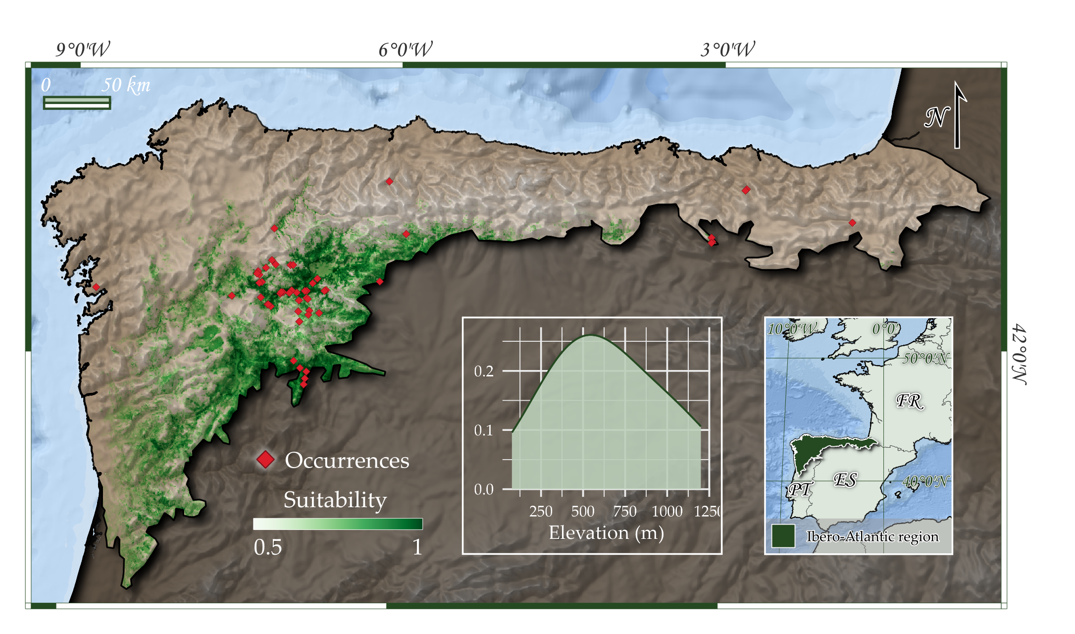 An acidophilous analogue of T21y, not benefitting of the percolating nature of limestones and therefore requiring drier macroclimates like those of the southwestern boundaries of the ecoregion, mostly in the orographically sheltered basin of El Bierzo, where they replace T19A in south-facing slopes. In the original EUNIS framework it should be included in the somewhat misnamed level VII unit T212422 (“Castilian encinares"), a new level IV unit becoming necessary for the reasons stated under T21x.