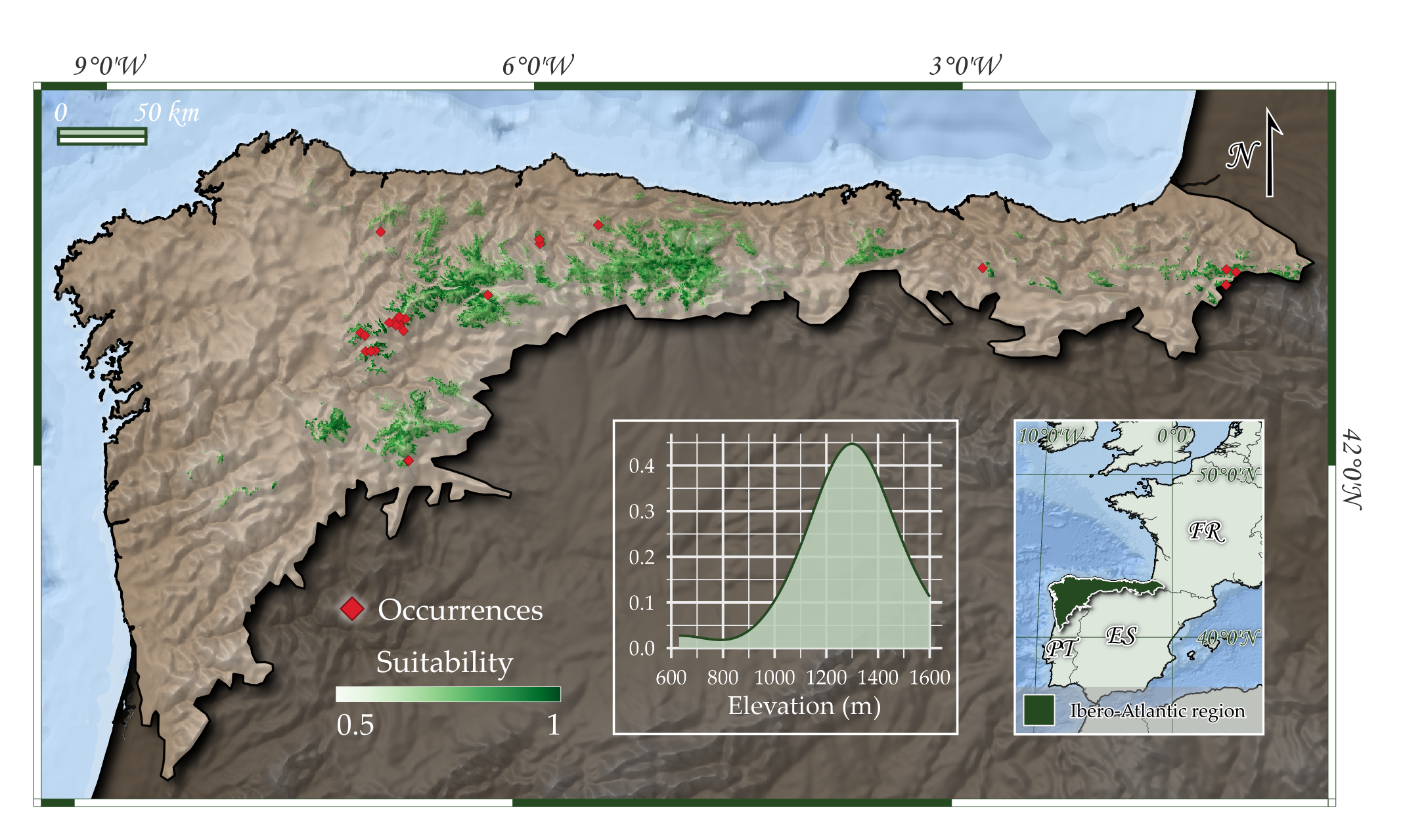 Known occurrences and potential area of occupancy of the habitat type in the study region.