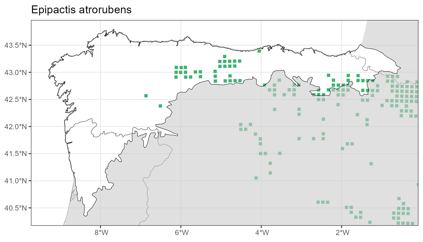 Localities (10 x 10 km) where the species has been recorded in the context of the study area. The complete distribution of the species in the Iberian Peninsula can be found in AFLIBER.