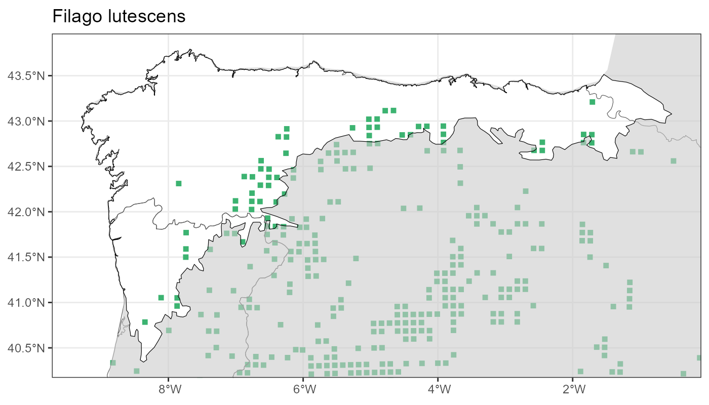 Localities (10 x 10 km) where the species has been recorded in the context of the study area. The complete distribution of the species in the Iberian Peninsula can be found in AFLIBER.