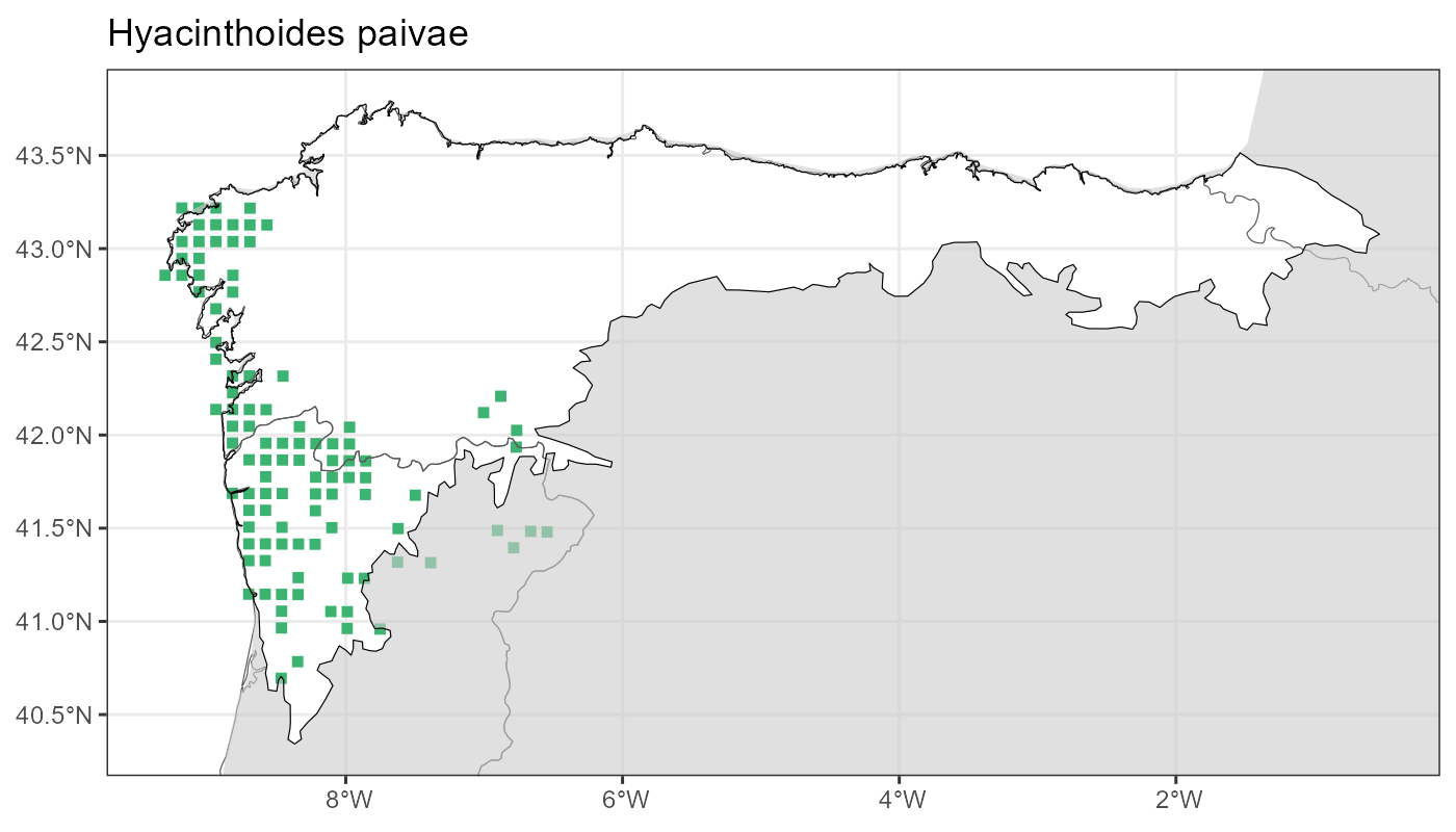 Localities (10 x 10 km) where the species has been recorded in the context of the study area. The complete distribution of the species in the Iberian Peninsula can be found in AFLIBER.
