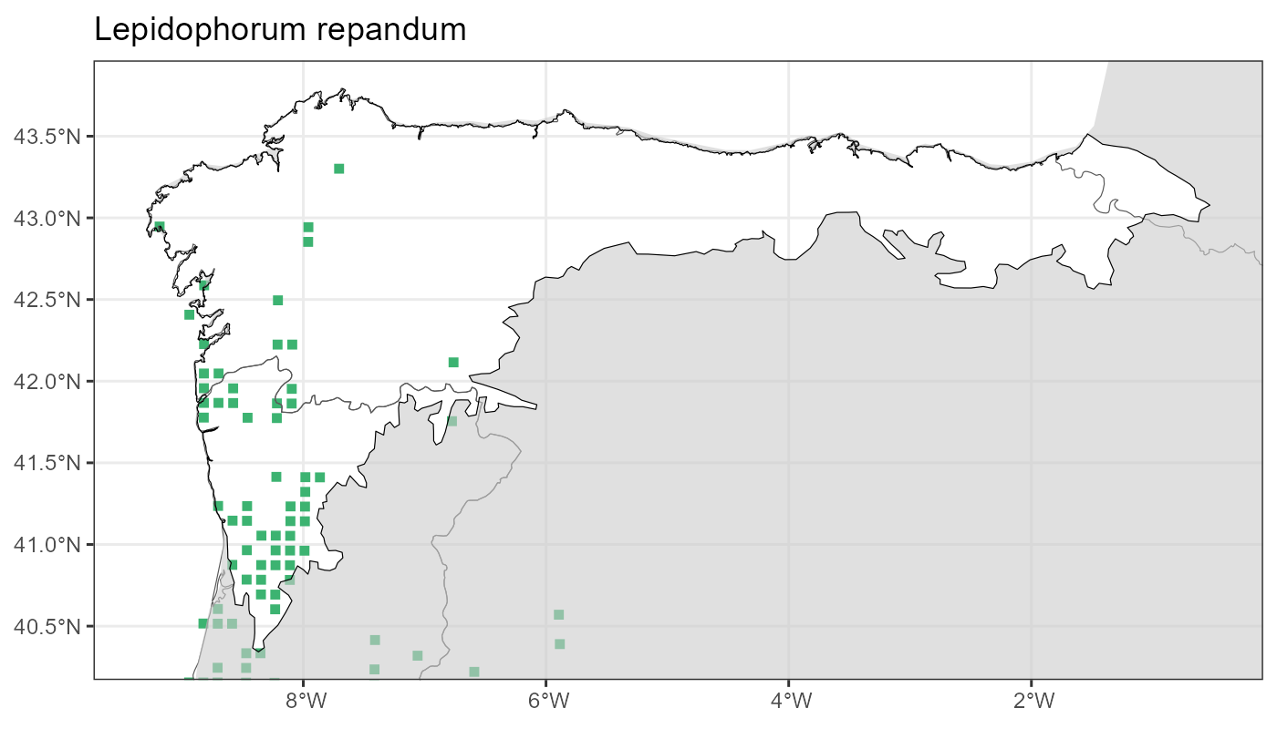 Localities (10 x 10 km) where the species has been recorded in the context of the study area. The complete distribution of the species in the Iberian Peninsula can be found in AFLIBER.