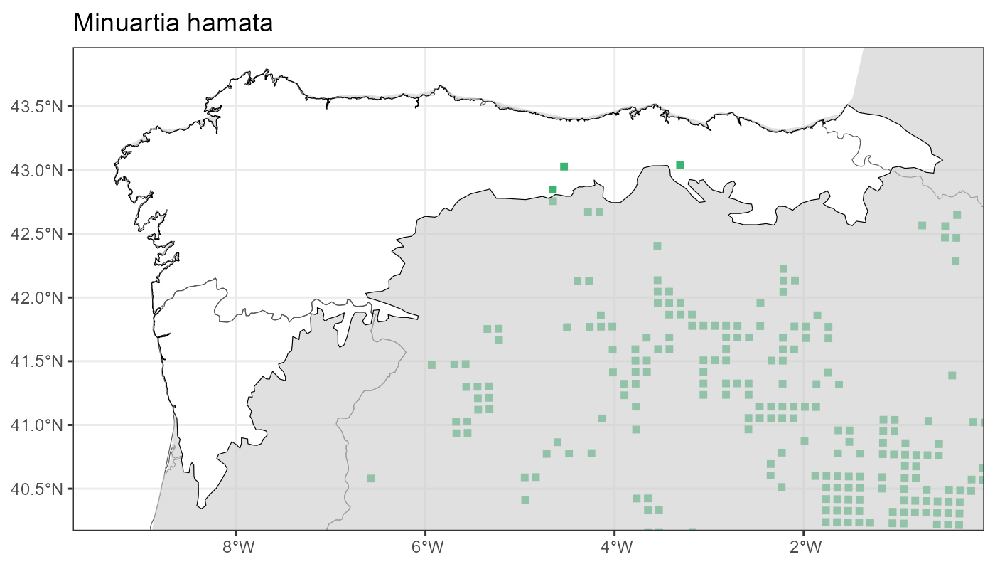 Localities (10 x 10 km) where the species has been recorded in the context of the study area. The complete distribution of the species in the Iberian Peninsula can be found in AFLIBER.