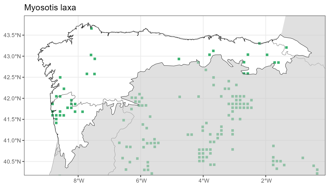Localities (10 x 10 km) where the species has been recorded in the context of the study area. The complete distribution of the species in the Iberian Peninsula can be found in AFLIBER.