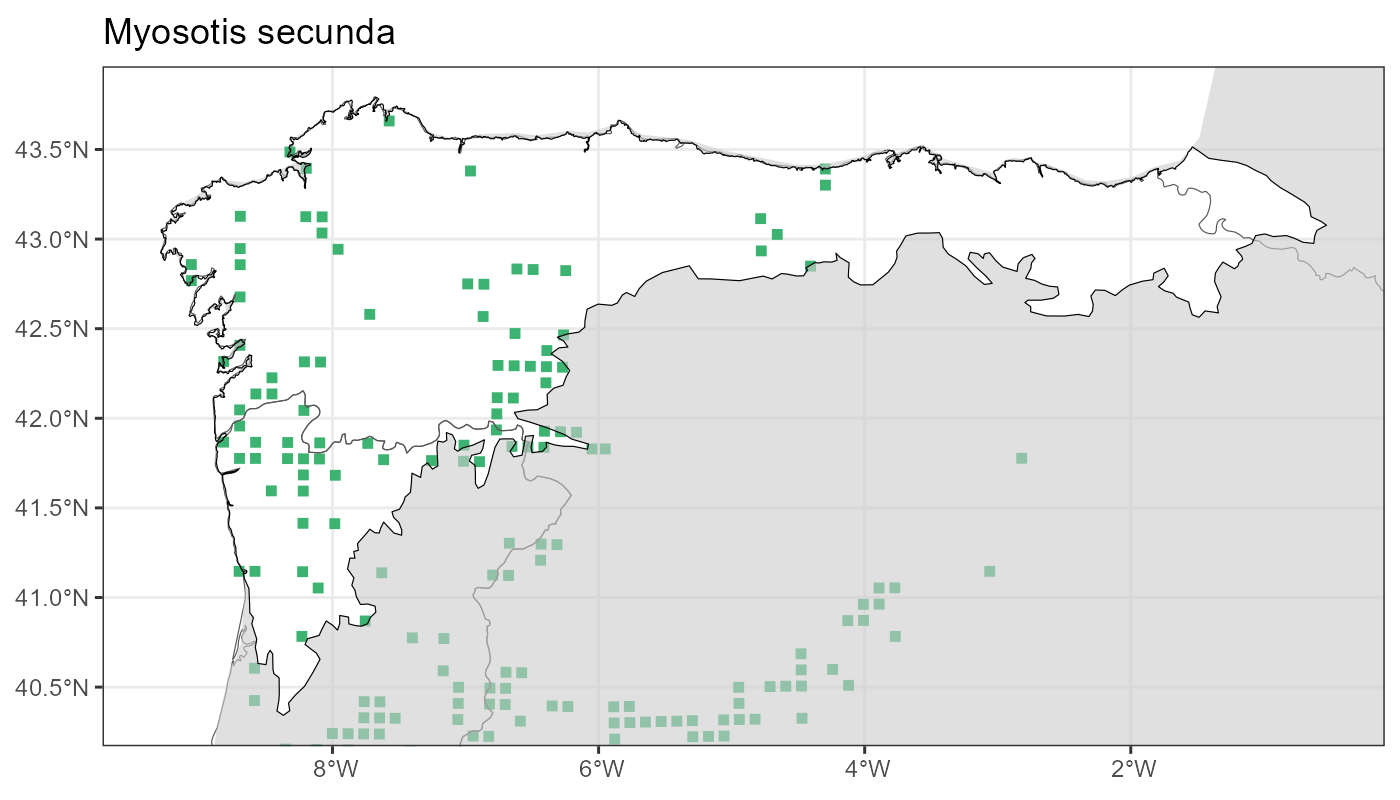 Localities (10 x 10 km) where the species has been recorded in the context of the study area. The complete distribution of the species in the Iberian Peninsula can be found in AFLIBER.