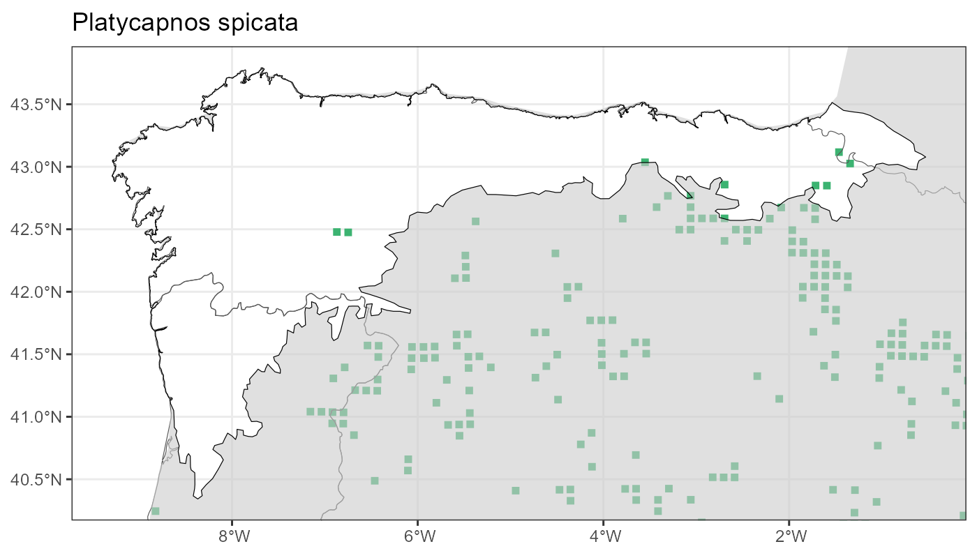 Localities (10 x 10 km) where the species has been recorded in the context of the study area. The complete distribution of the species in the Iberian Peninsula can be found in AFLIBER.