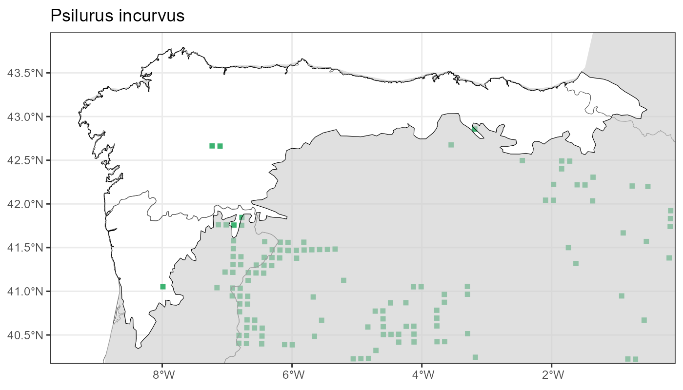 Localities (10 x 10 km) where the species has been recorded in the context of the study area. The complete distribution of the species in the Iberian Peninsula can be found in AFLIBER.