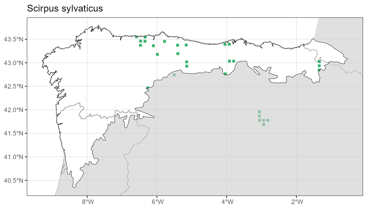 Localities (10 x 10 km) where the species has been recorded in the context of the study area. The complete distribution of the species in the Iberian Peninsula can be found in AFLIBER.