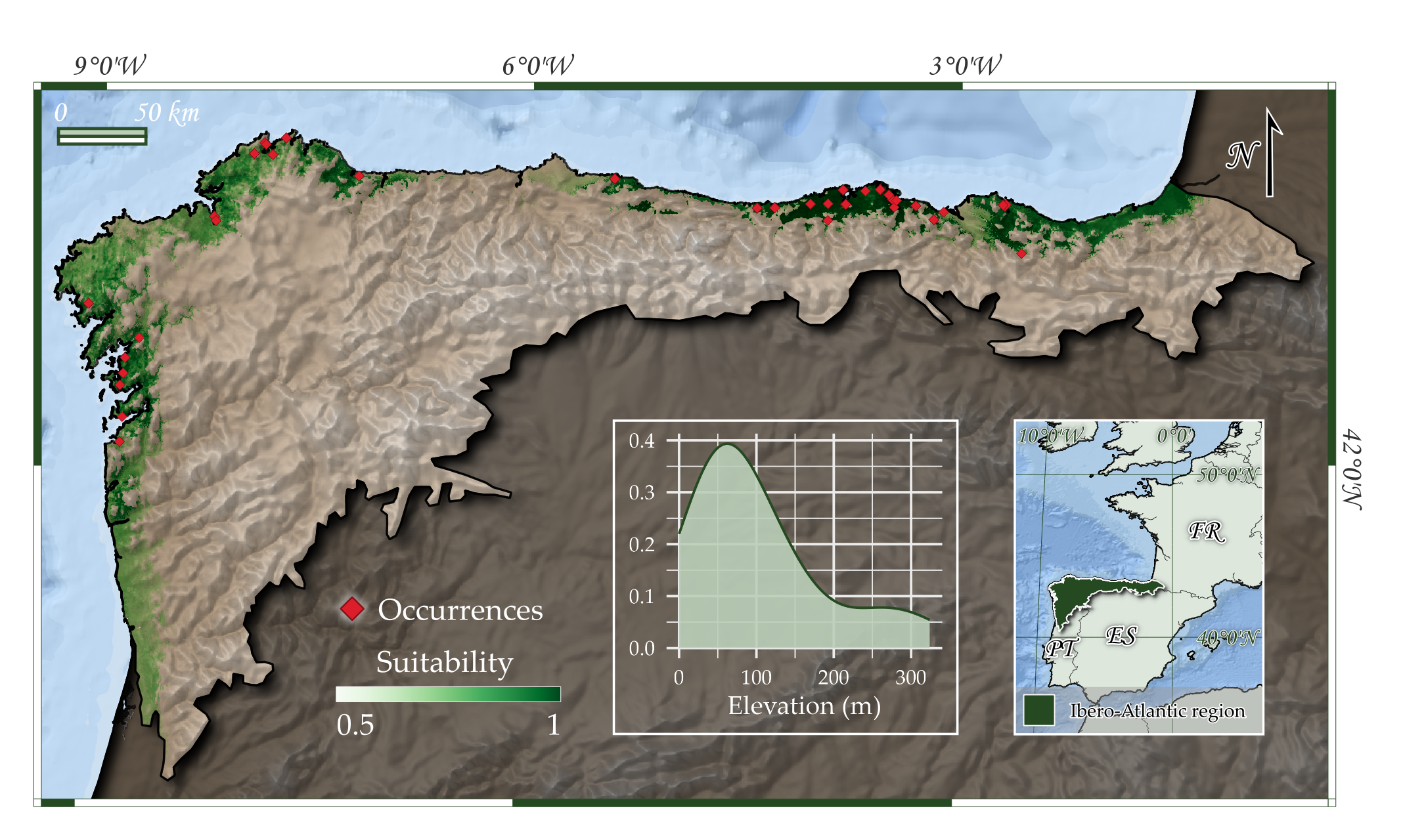 Ocurrencias conocidas y área potencial de ocupación del tipo de hábitat en la región de estudio.