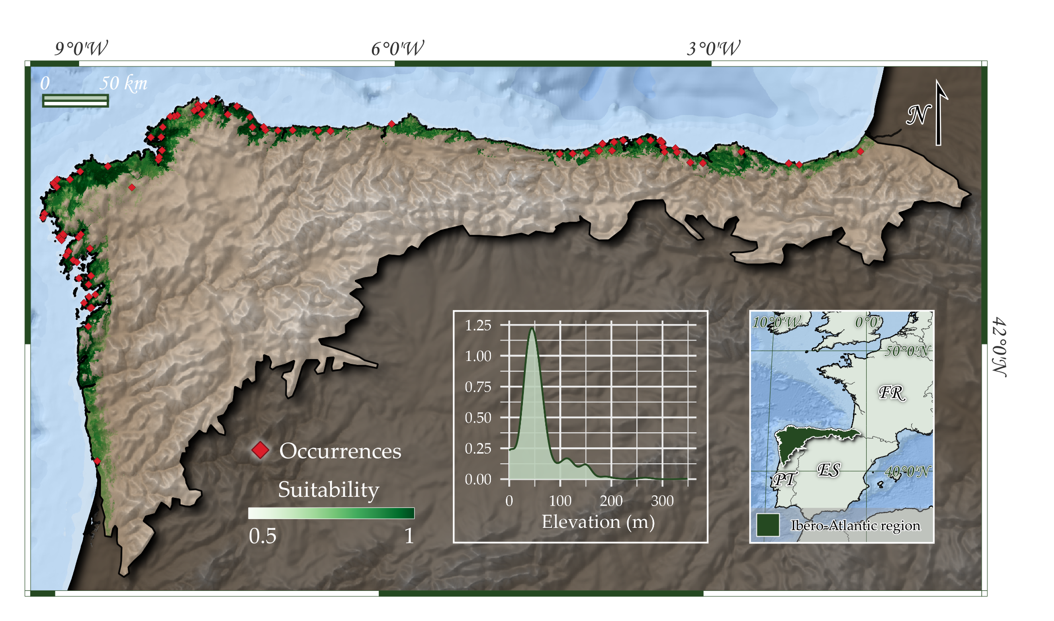 Ocurrencias conocidas y área potencial de ocupación del tipo de hábitat en la región de estudio.