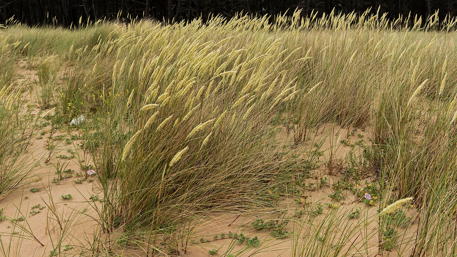 Herbazales dominados por Ammophila arenaria en zonas algo internas, parcialmente fijadas, de sistemas dunares costeros.