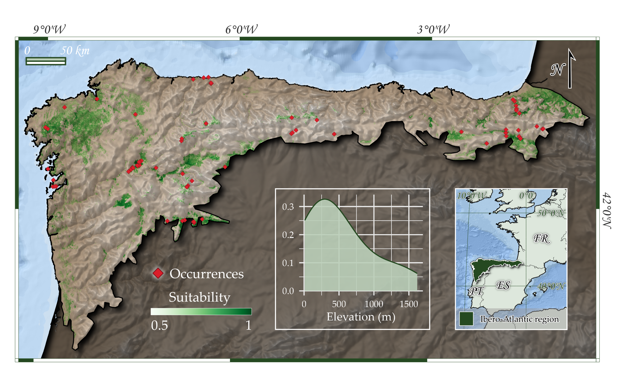 Ocurrencias conocidas y área potencial de ocupación del tipo de hábitat en la región de estudio.