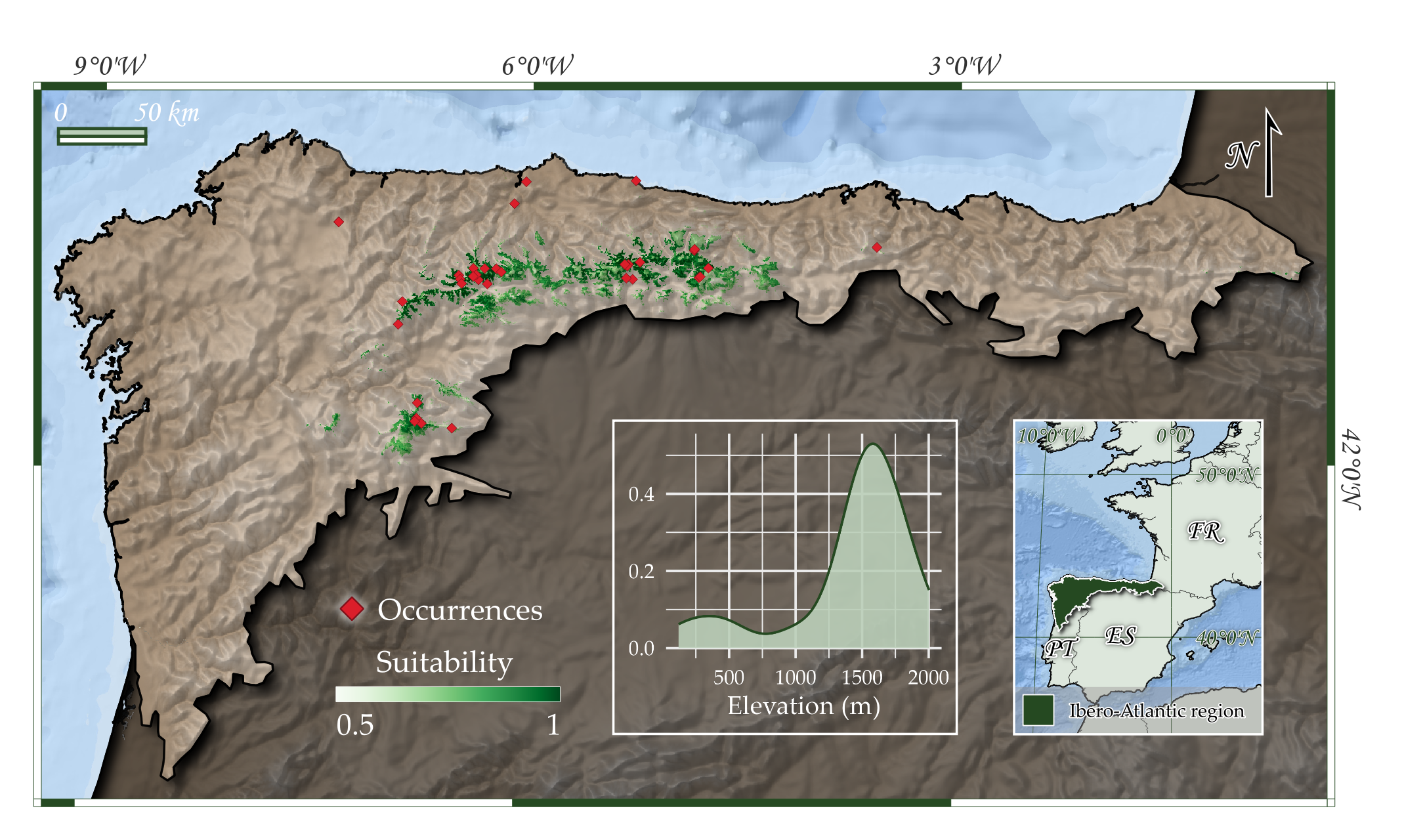 Ocurrencias conocidas y área potencial de ocupación del tipo de hábitat en la región de estudio.