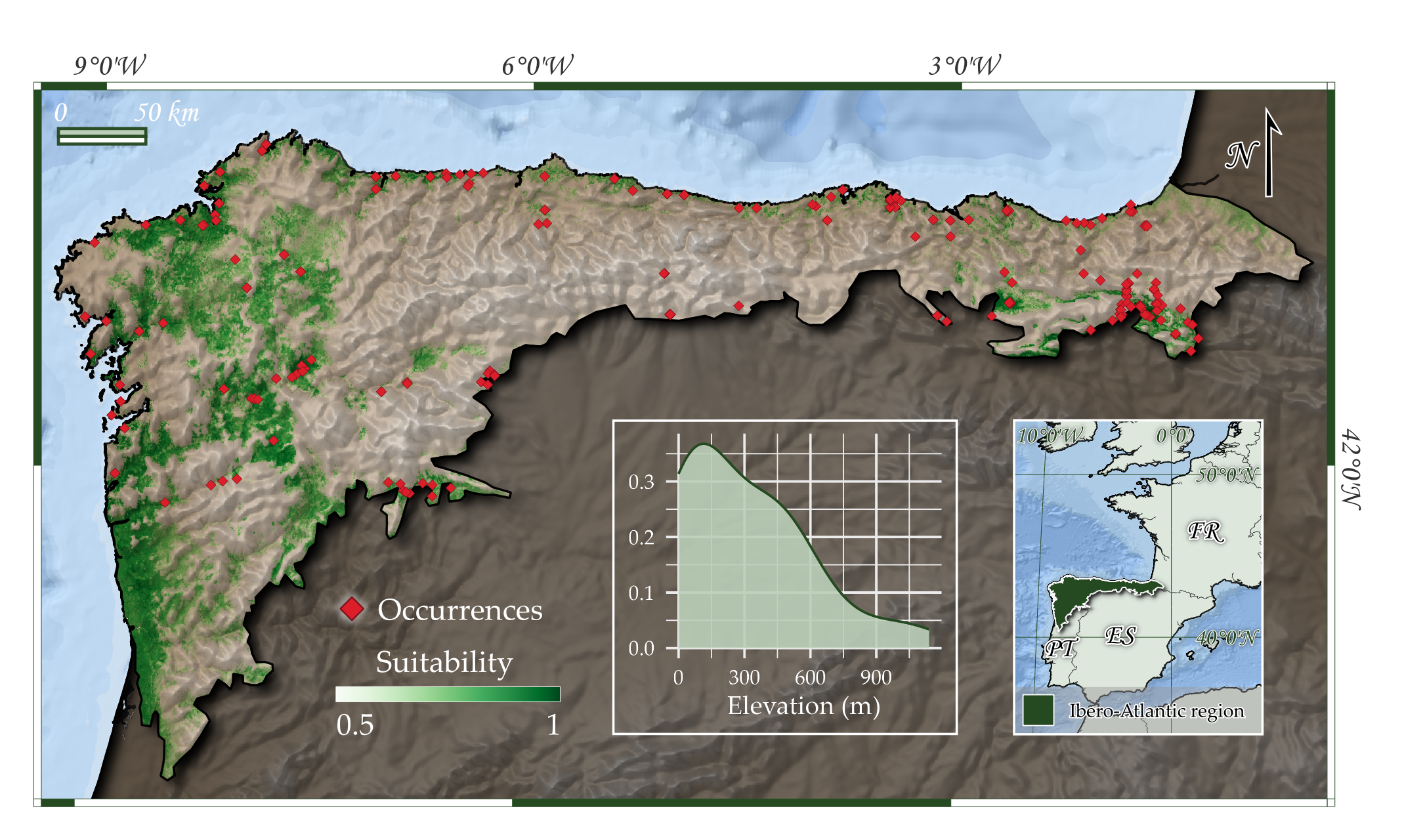 Ocurrencias conocidas y área potencial de ocupación del tipo de hábitat en la región de estudio.