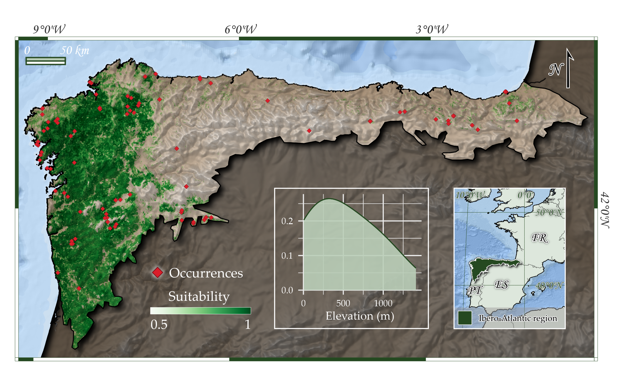 Ocurrencias conocidas y área potencial de ocupación del tipo de hábitat en la región de estudio.