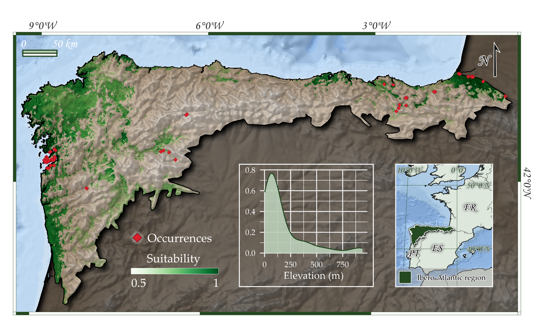 Ocurrencias conocidas y área potencial de ocupación del tipo de hábitat en la región de estudio.