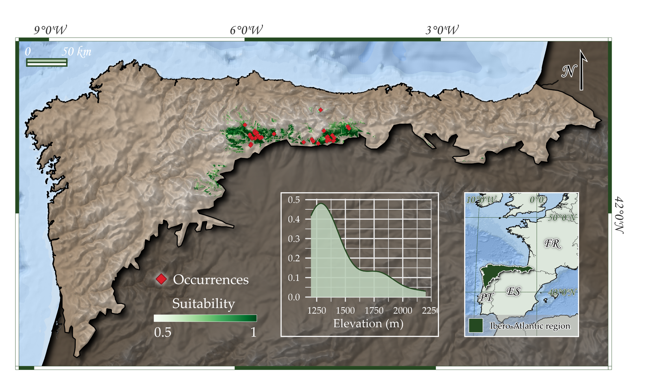 Ocurrencias conocidas y área potencial de ocupación del tipo de hábitat en la región de estudio.