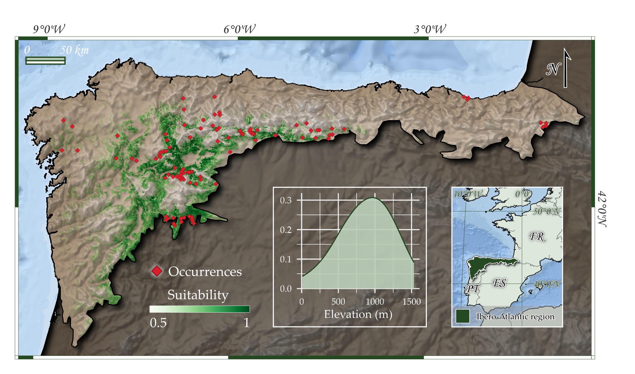 Ocurrencias conocidas y área potencial de ocupación del tipo de hábitat en la región de estudio.