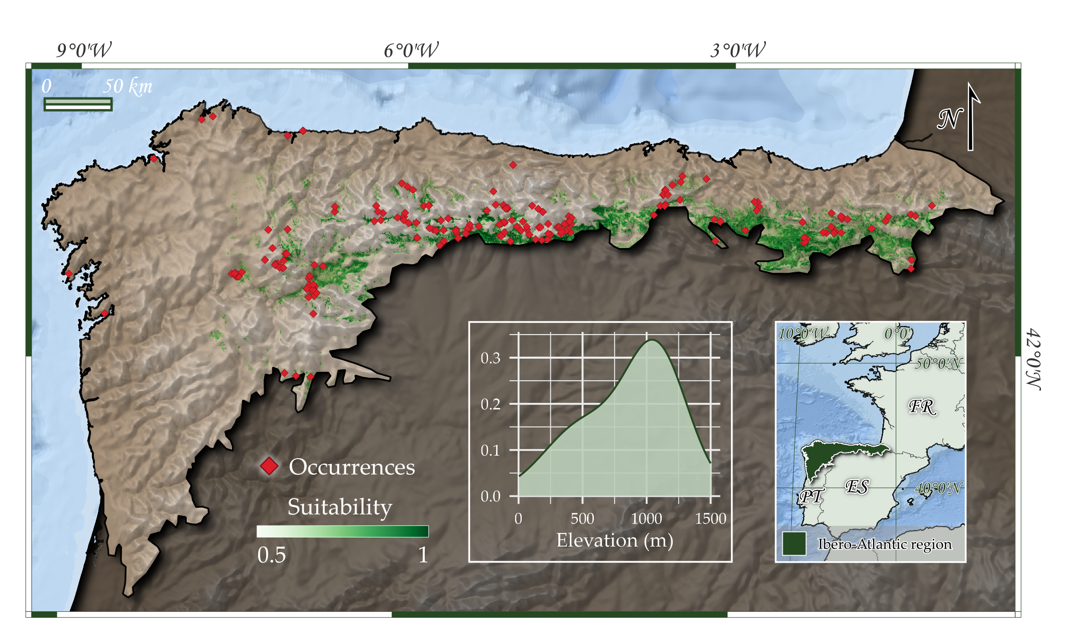 Ocurrencias conocidas y área potencial de ocupación del tipo de hábitat en la región de estudio.