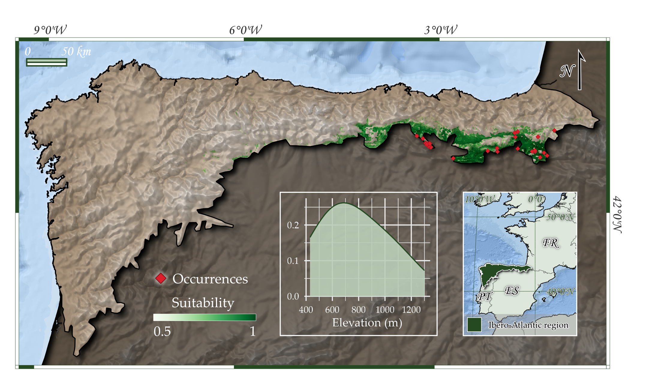 Ocurrencias conocidas y área potencial de ocupación del tipo de hábitat en la región de estudio.