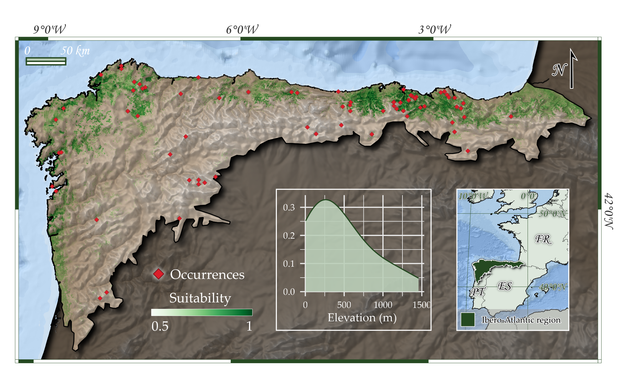 Ocurrencias conocidas y área potencial de ocupación del tipo de hábitat en la región de estudio.