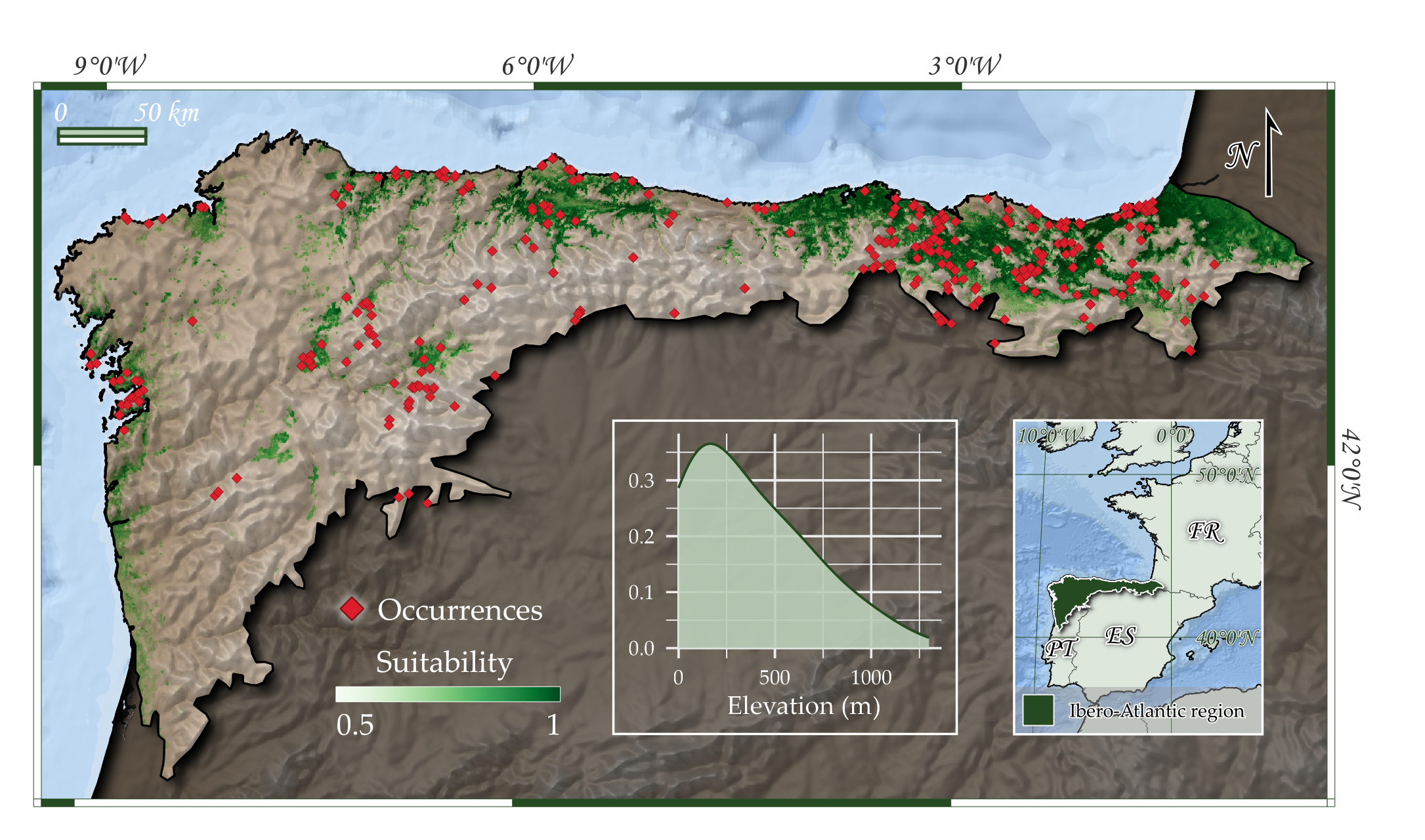Ocurrencias conocidas y área potencial de ocupación del tipo de hábitat en la región de estudio.