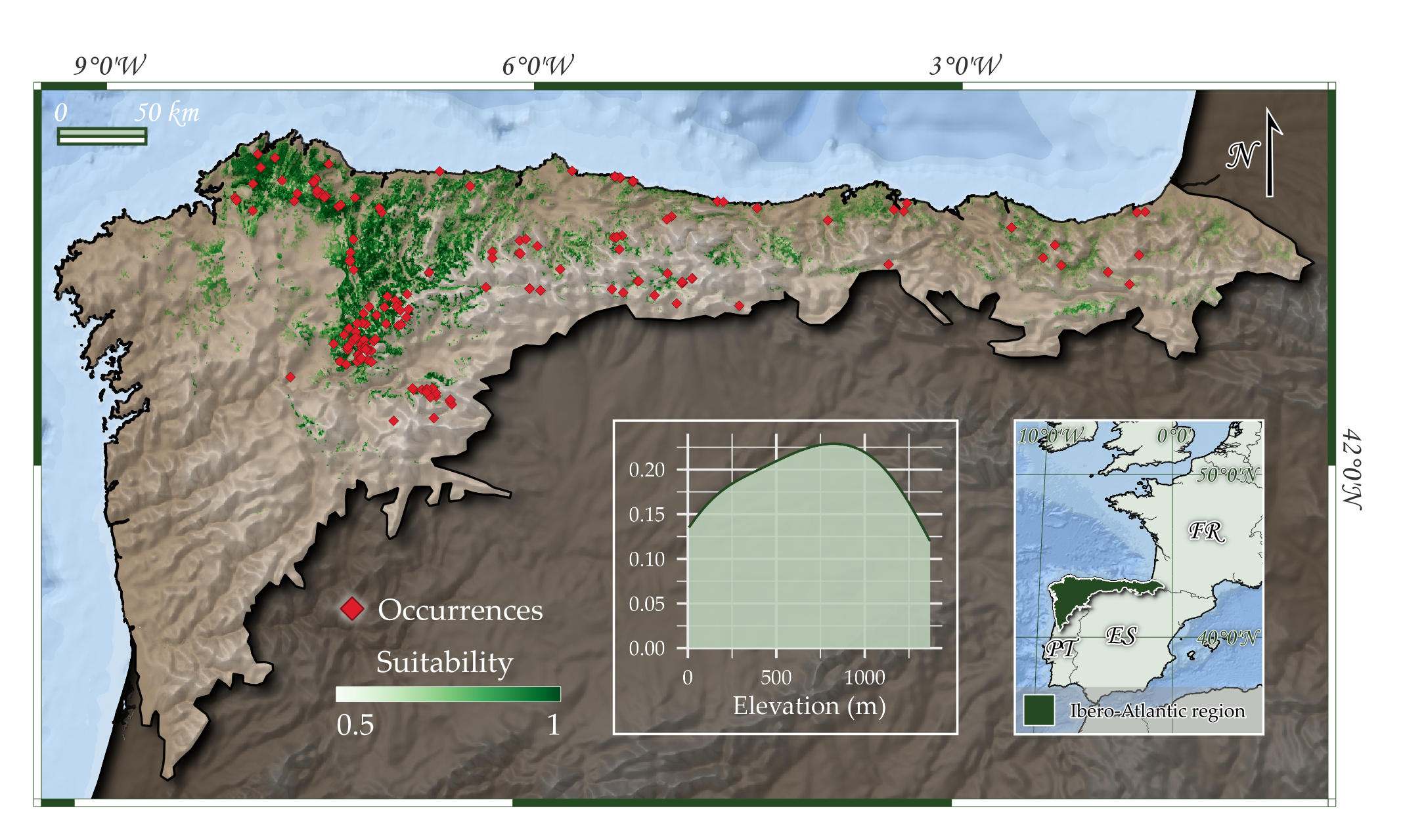 Ocurrencias conocidas y área potencial de ocupación del tipo de hábitat en la región de estudio.