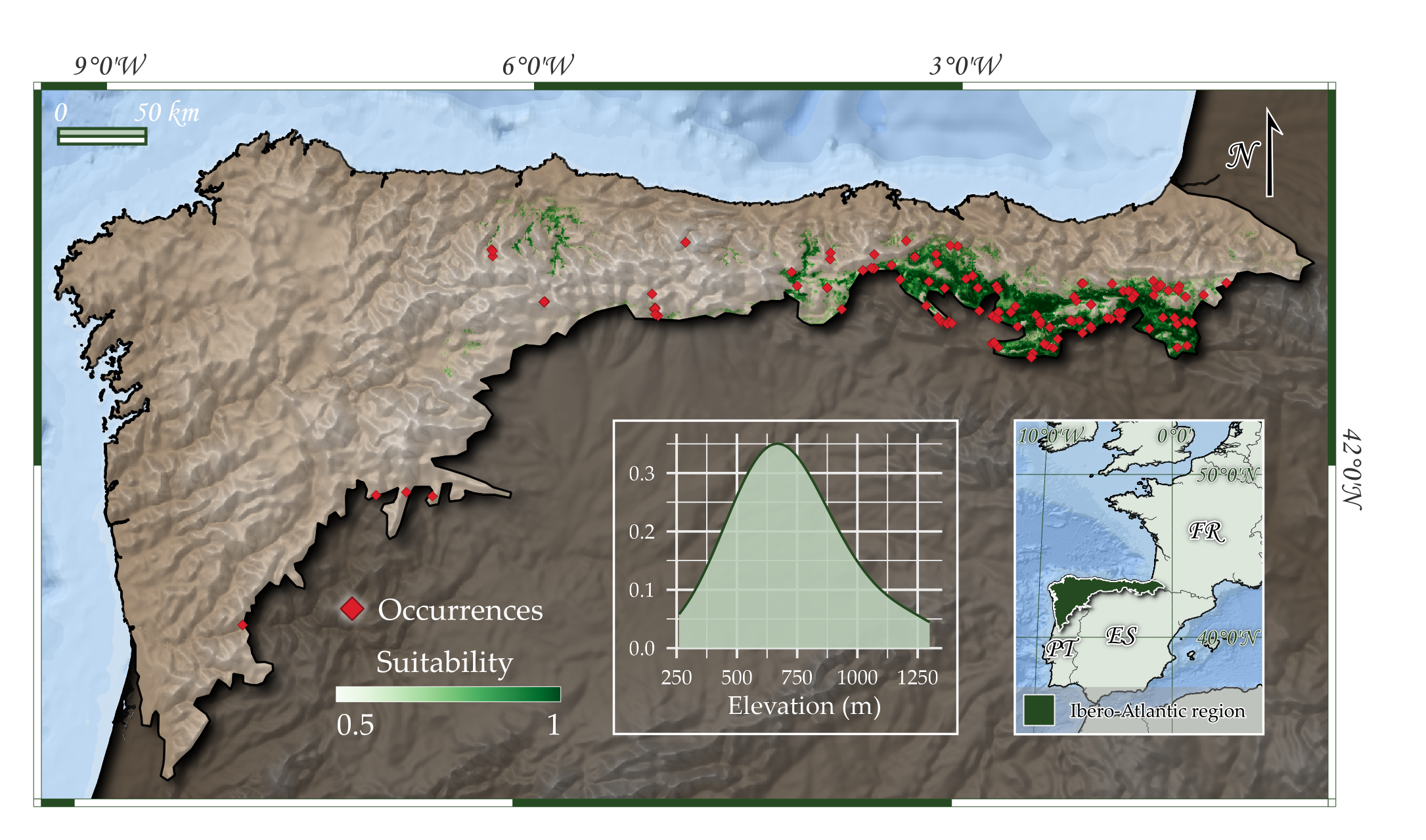 Ocurrencias conocidas y área potencial de ocupación del tipo de hábitat en la región de estudio.