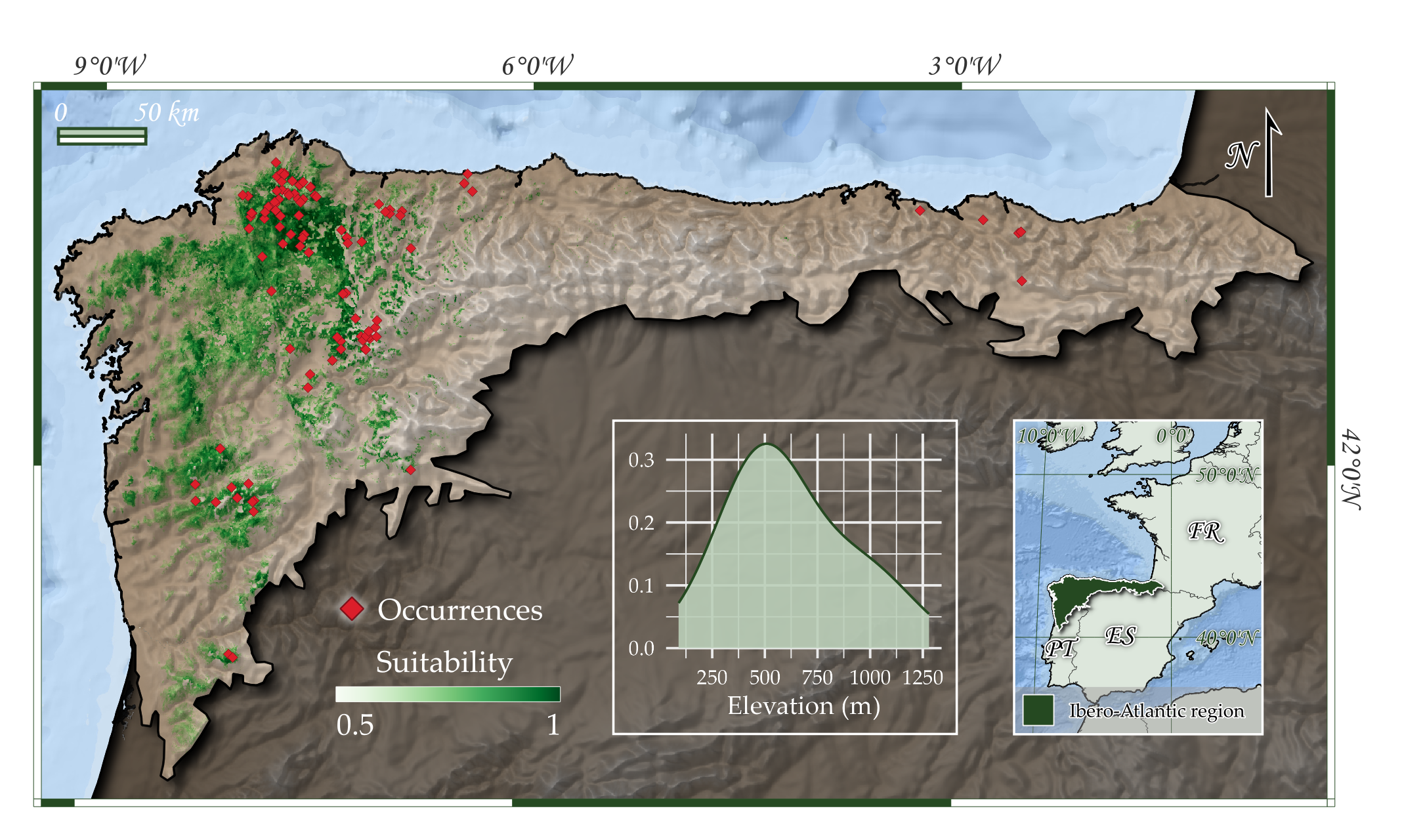 Ocurrencias conocidas y área potencial de ocupación del tipo de hábitat en la región de estudio.
