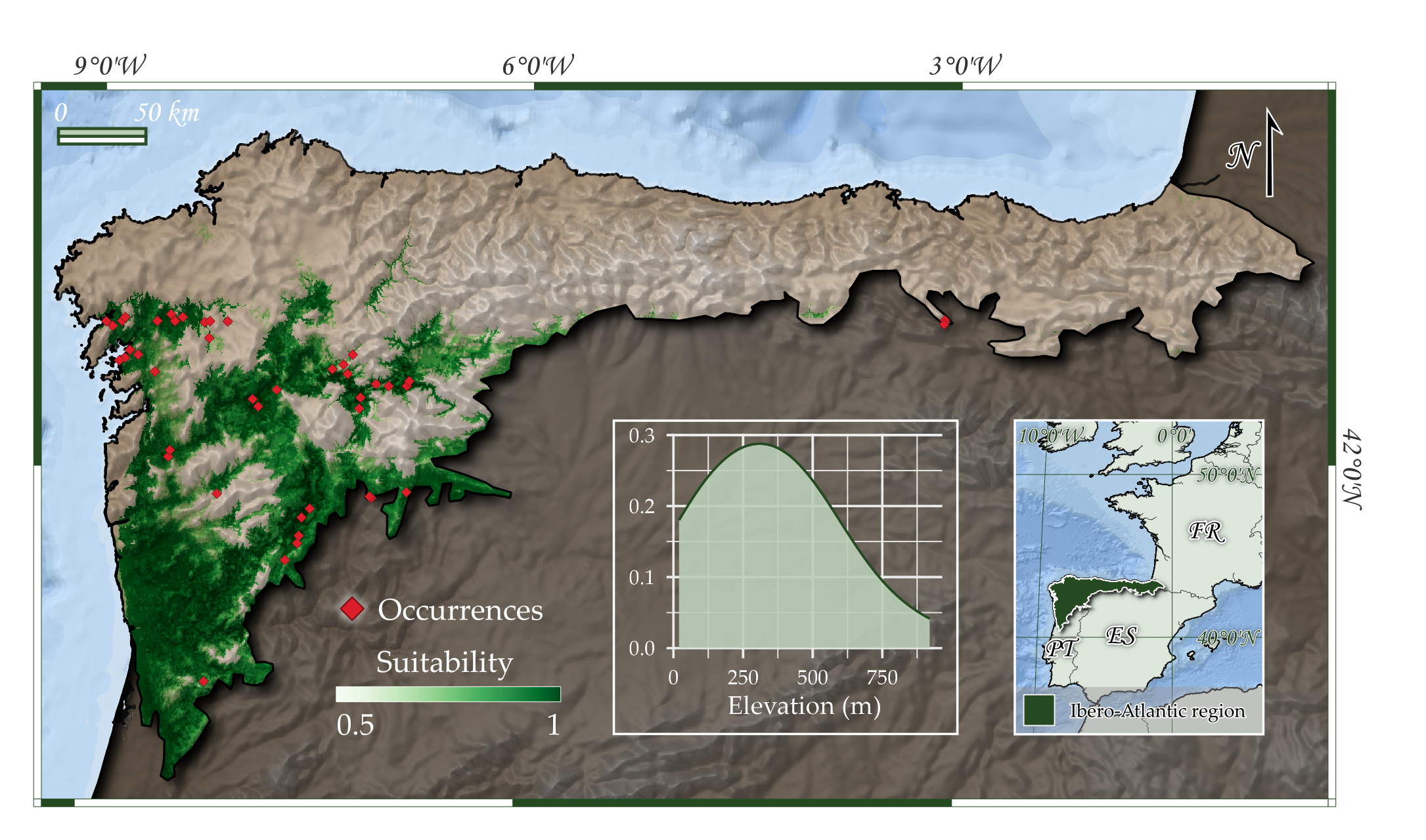 Ocurrencias conocidas y área potencial de ocupación del tipo de hábitat en la región de estudio.