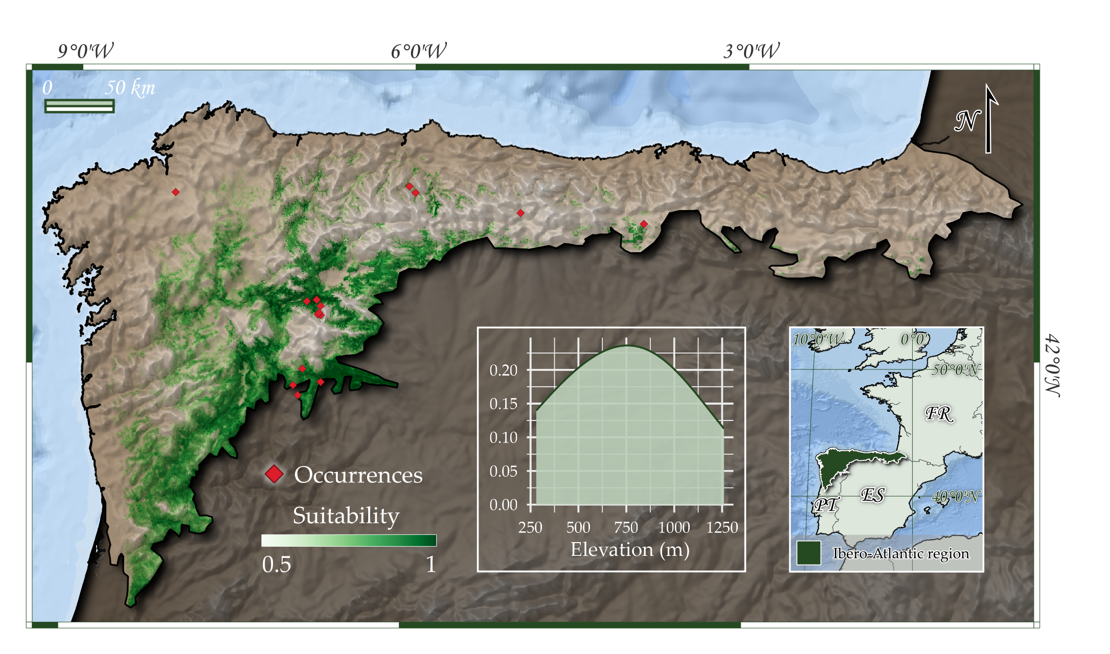 Ocurrencias conocidas y área potencial de ocupación del tipo de hábitat en la región de estudio.