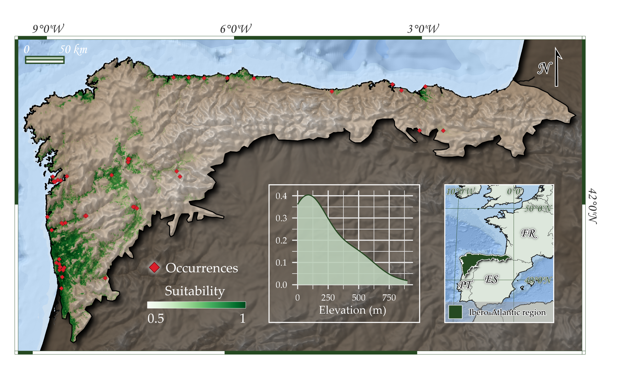 Ocurrencias conocidas y área potencial de ocupación del tipo de hábitat en la región de estudio.