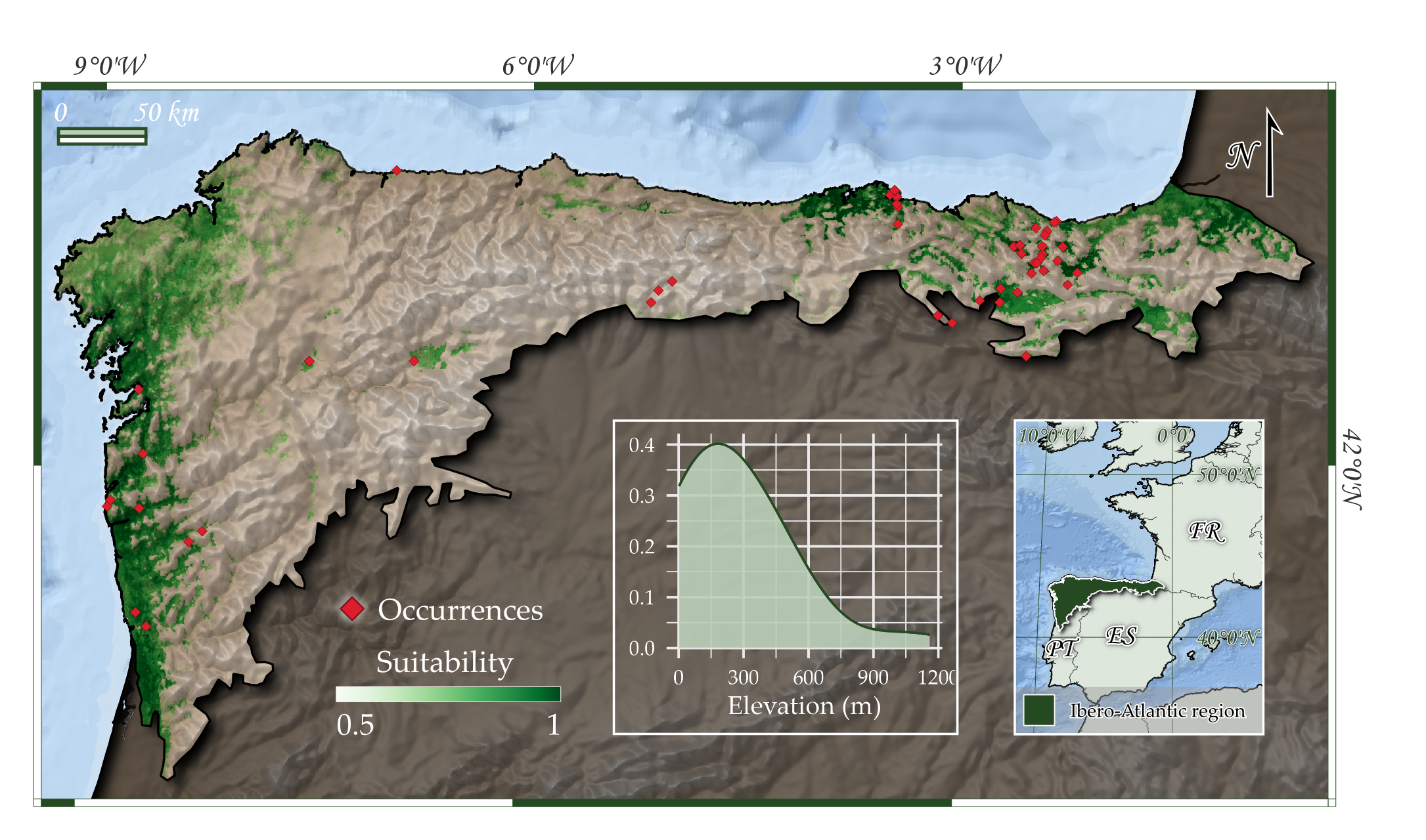 Ocurrencias conocidas y área potencial de ocupación del tipo de hábitat en la región de estudio.