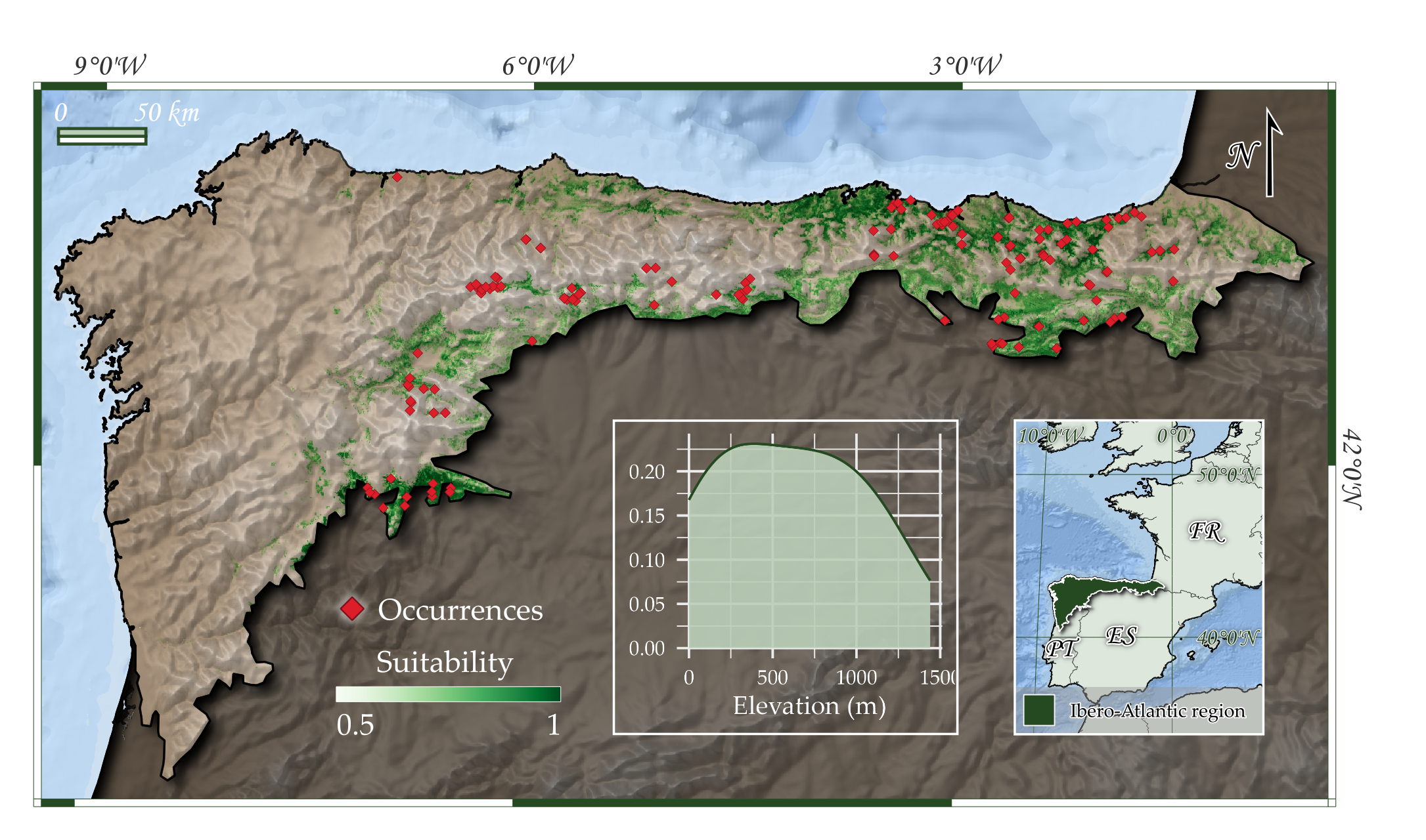 Ocurrencias conocidas y área potencial de ocupación del tipo de hábitat en la región de estudio.