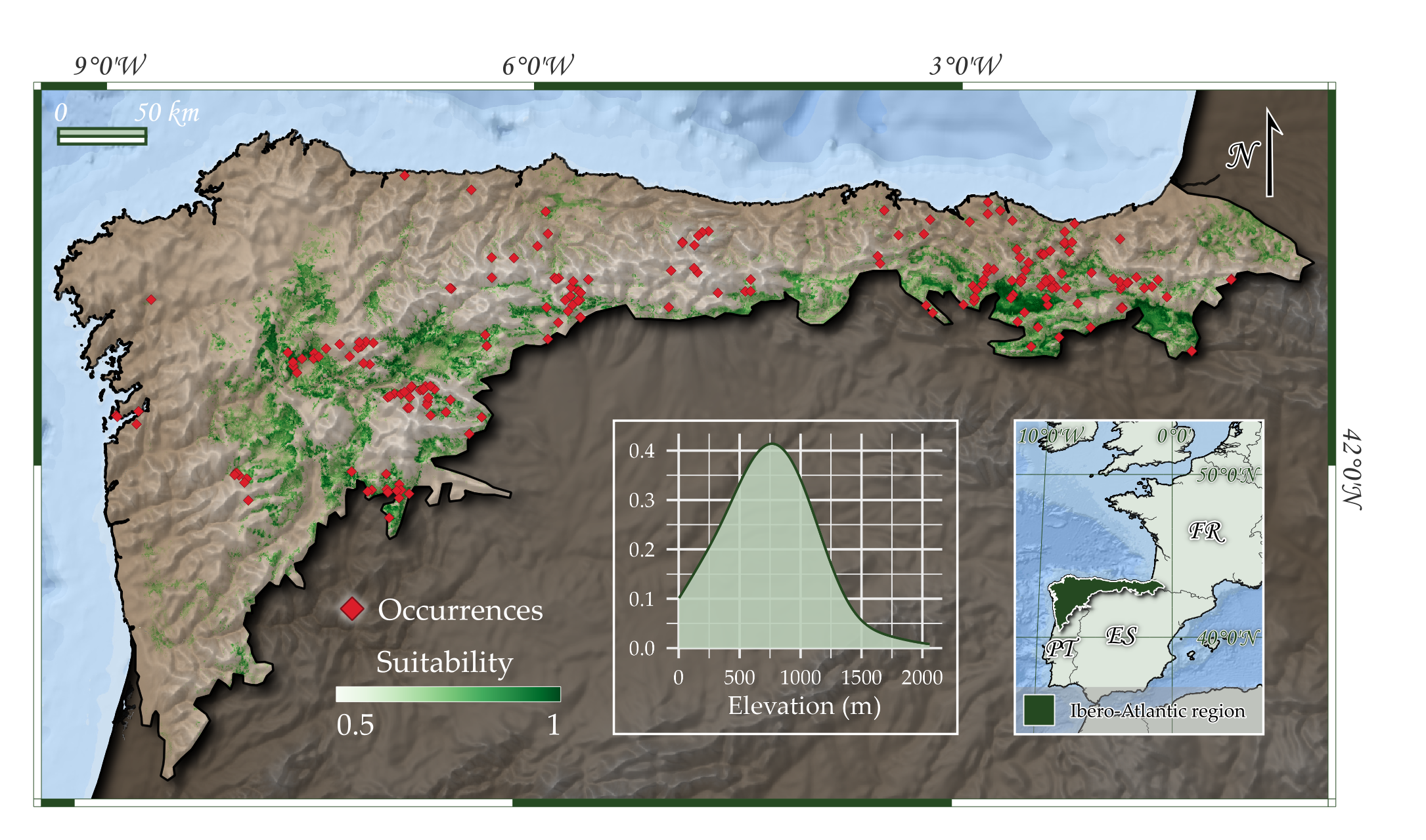 Ocurrencias conocidas y área potencial de ocupación del tipo de hábitat en la región de estudio.